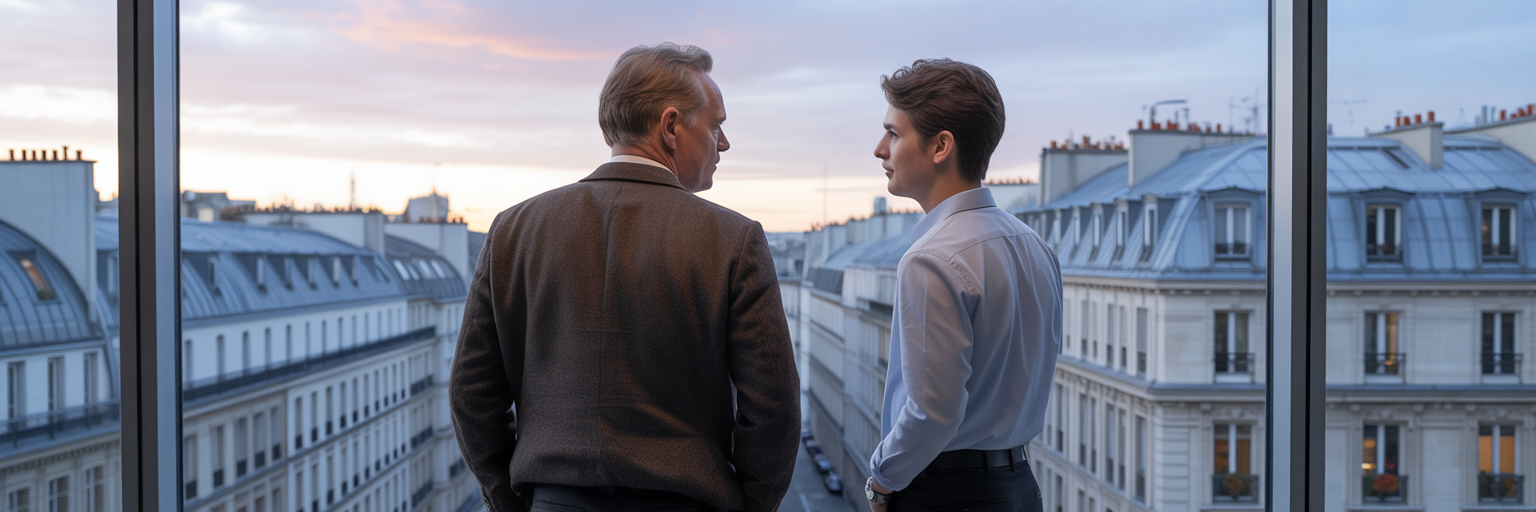 Deux professionnels discutant des perspectives d'avenir à Paris.
