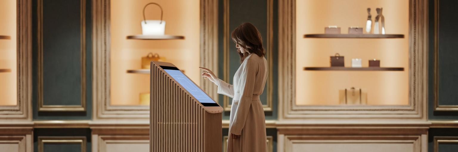 Client interagissant avec un kiosque intelligent dans une boutique.